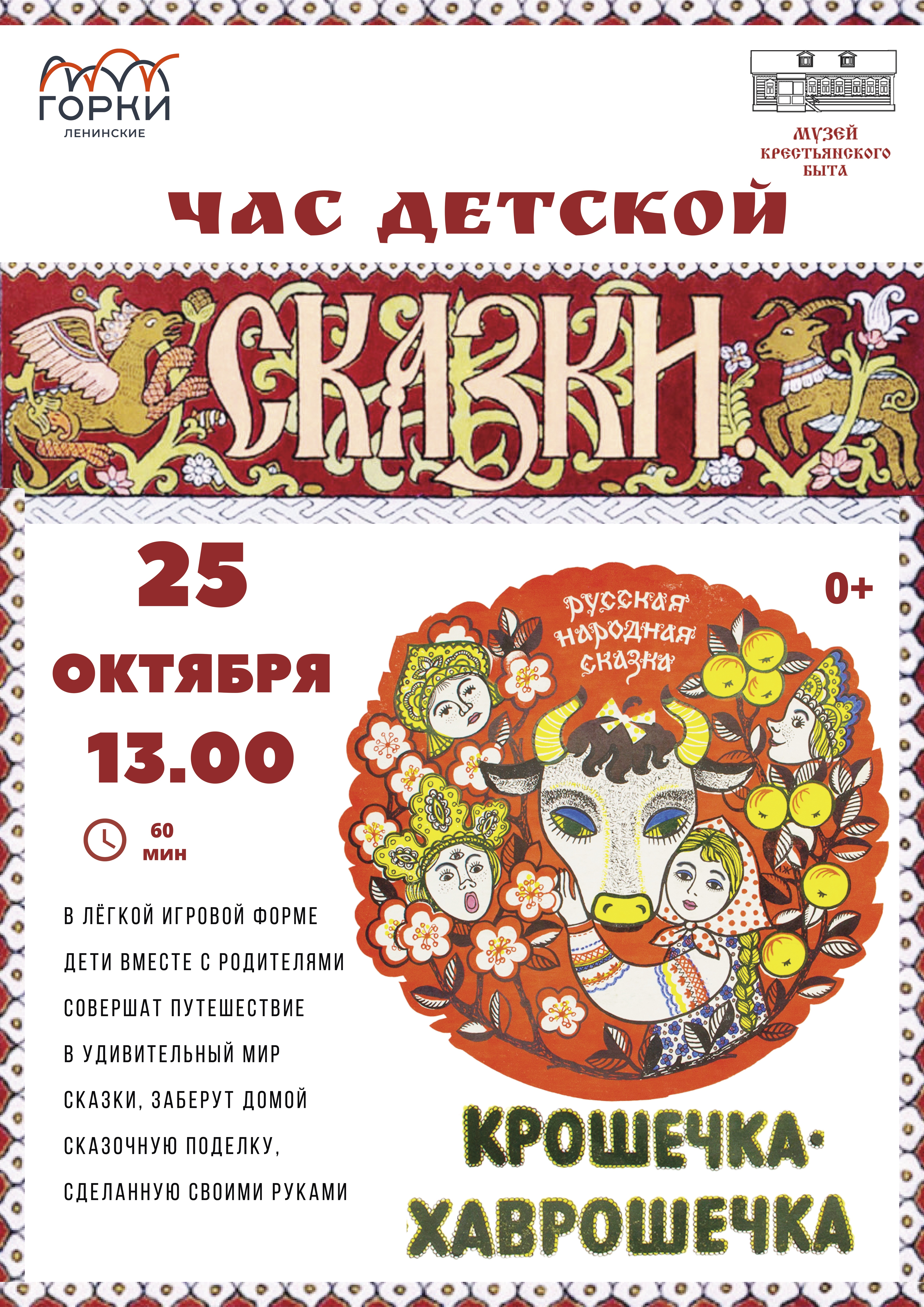 Интерактивная музейная программа для детей от 3-х до 7-ми лет проводится в легкой игровой форме и приглашает участников в мир сказки. Русские сказки развивают фантазию, поэтому во время прочтения произведения участники изготовят творческую поделку по сказочной тематике. Пример сказок: В. Катаев «Цветик-семицветик», П. Бажов «Серебряное копытце», М.Михайлов «Два Мороза», С.Топелиус «Три ржаных колоска» и др.