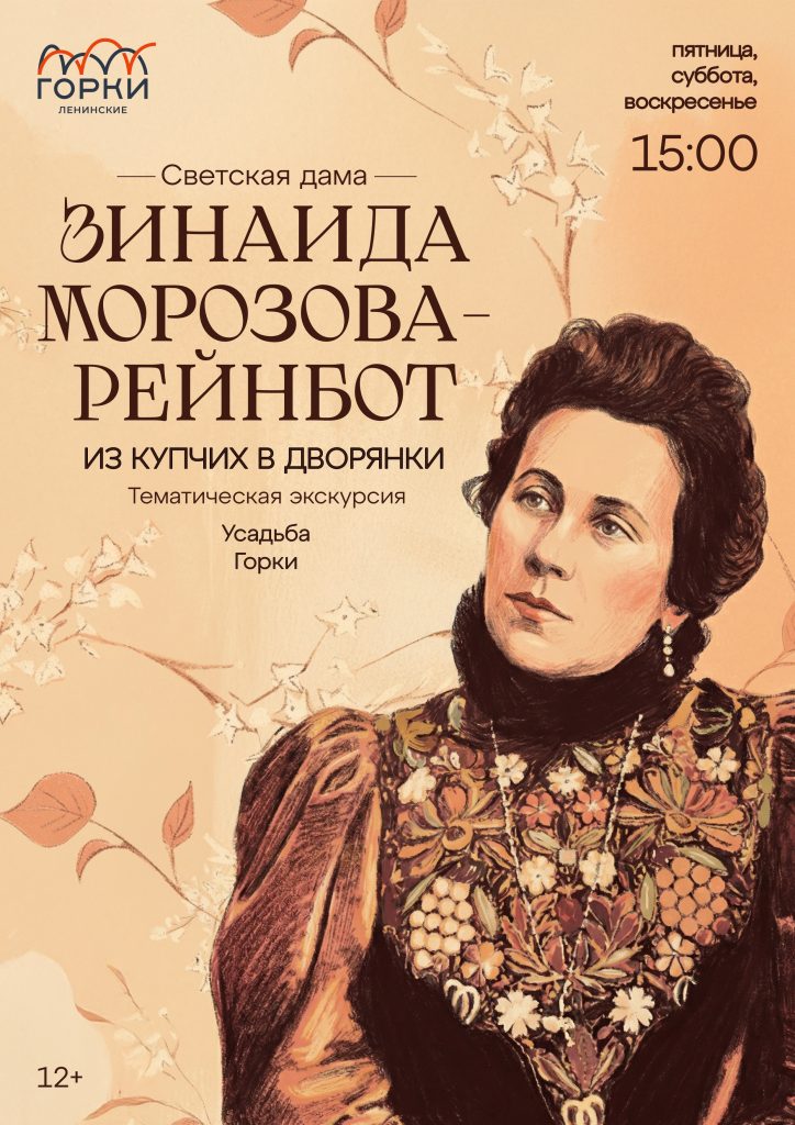 Экскурсия посвящена последней владелице усадьбы Горки – Зинаиде Григорьевне Морозовой-Рейнбот. Она была не только предприимчивой хозяйкой, но и известной в столице светской дамой. В 1888 году урожденная Зиновия Зимина вышла замуж за богатейшего предпринимателя России – Савву Тимофеевича Морозова. Участники экскурсии посетят Большой дом усадьбы и узнают о красивой жизни хозяйки в Горках и за их пределами.
