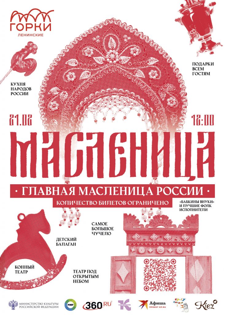 Вас ждёт настоящий народный размах • кухни народов России • конный театр • лучшие артисты российской фолк-сцены • ярмарка мастеров • интерактивные площадки, творчество, конкурсы и живое общение • театр под открытым небом Кульминация праздника – сжигание самого высокого чучела в России! Мощный символ, который всегда сопровождает праздник.