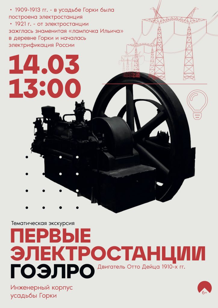 Во время экскурсии по выставке посетители узнают, как создавалась и работала Государственная комиссия по электрификации России, как проходил Vlll Всероссийский съeзд Советов. Речь пойдет и о «первенцах» ГОЭЛРО – первых электростанциях, построенных в рамках плана Государственной электрификации России. В инженерном корпусе посетители увидят нефтяной двигатель Отто Дейца, принадлежавший последним владельцам усадьбы Горки и являющийся памятником науки и техники, познакомятся с принципом его работы и узнают о его роли в процессе электрификации деревни Горки.