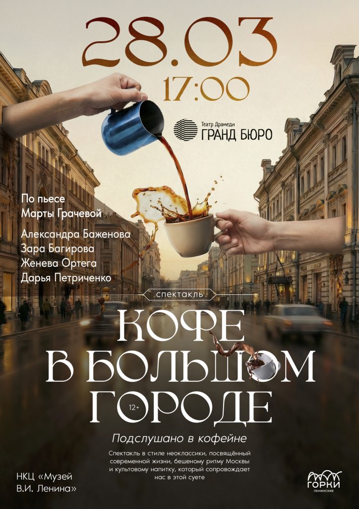 «Кофе в большом городе» - это пронзительно искренний и тёплый спектакль в стиле неоклассики, посвящённый современной жизни, бешеному ритму Москвы и культовому напитку, который сопровождает нас в этой суете. Это история о близком и понятном, рассказанная с лёгкостью и искромётным юмором, без лишнего драматизма и пошлости.