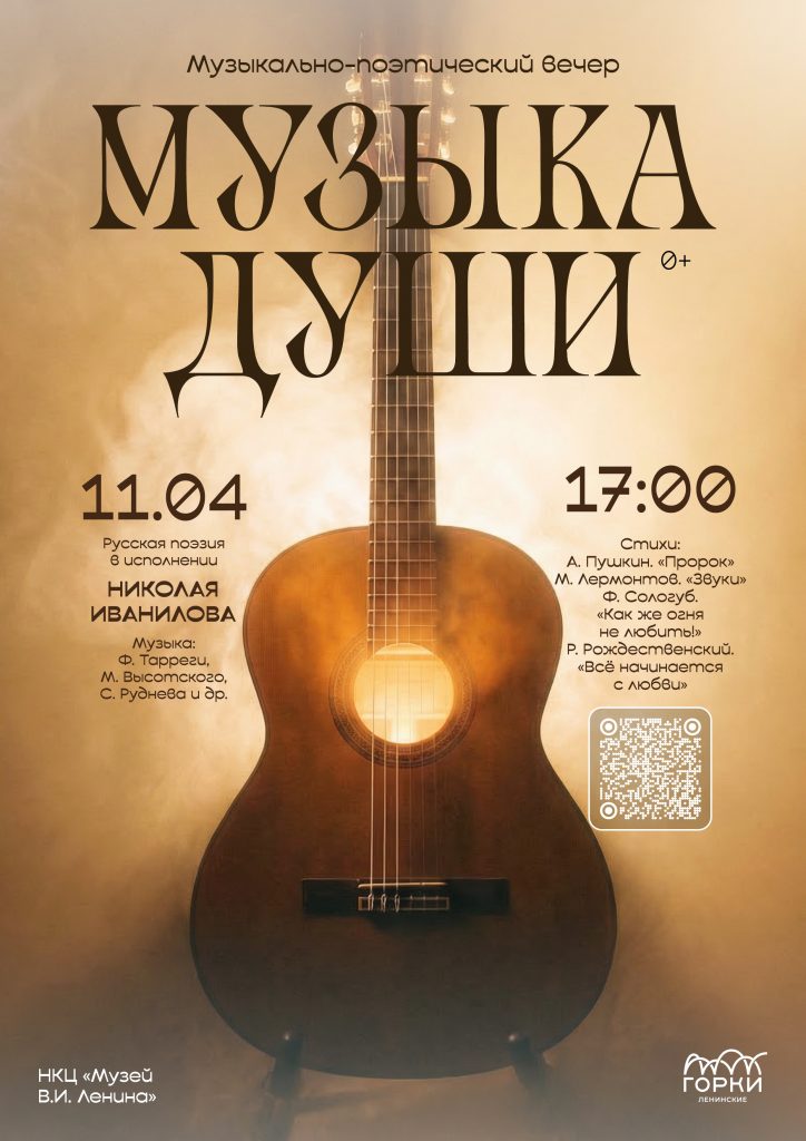 «Музыка души», музыкально-поэтический вечер - это событие, где музыка и поэзия станут равноправными партнёрами, зрители смогут пережить широкий спектр эмоций. В рамках концертной программы прозвучат сочинения для классической гитары, обработки народной музыки, переложения старинной и современной классической музыки, стихи различных авторов в исполнении молодого артиста Николая Иванилова. Репертуар: музыка Ф.Тарреги, М.Высотского, С.Руднева и др., стихи А.Пушкина, М.Лермонтова и др. Классическая гитара обладает мягким, уютным тембром, который гармонично сочетается с ярким и темпераментным звучанием. На гитаре можно исполнять произведения самых разных стилей и жанров.