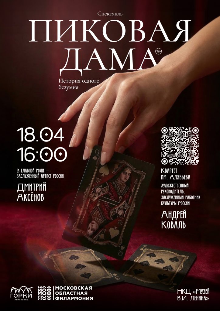 Спектакль по самому загадочному и мистическому произведению А.С. Пушкина. Картинки из жизни золотой молодёжи великосветского общества. Любовные интриги, огненная страсть, азарт игры и тайная недоброжелательность. Виртуозная актёрская игра Заслуженного артиста России Дмитрия Аксёнова и великолепная классическая музыка в исполнении музыкантов квартета им. Алябьева. Квартет им. Алябьева. Андрей Коваль / альт – художественный руководитель, заслуженный работник культуры России. Илья Ткаченко /первая скрипка Светлана Нор/вторая скрипка Владимир Нор/виолончель
