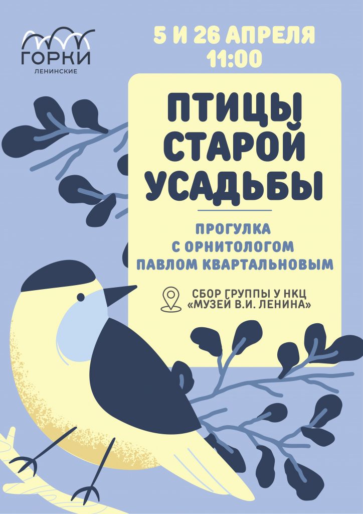 Расположение усадьбы «Горки Ленинские» особо благоприятно для знакомства с птицами. На территории и по соседству с ней много культурных деревьев и кустарников, обеспечивающих птиц кормом почти круглый год. Благодаря растущим на территории дубам в усадьбе можно встретить среднего пестрого дятла — птицу, редкую в Подмосковье. Апрель — самое удобное время для знакомства с птицами. Многие из них поют активно, но еще не заглушают друг друга, позволяют сориентироваться в разнообразии издаваемых ими звуков, подготовиться к многоголосью конца весны и начала лета.