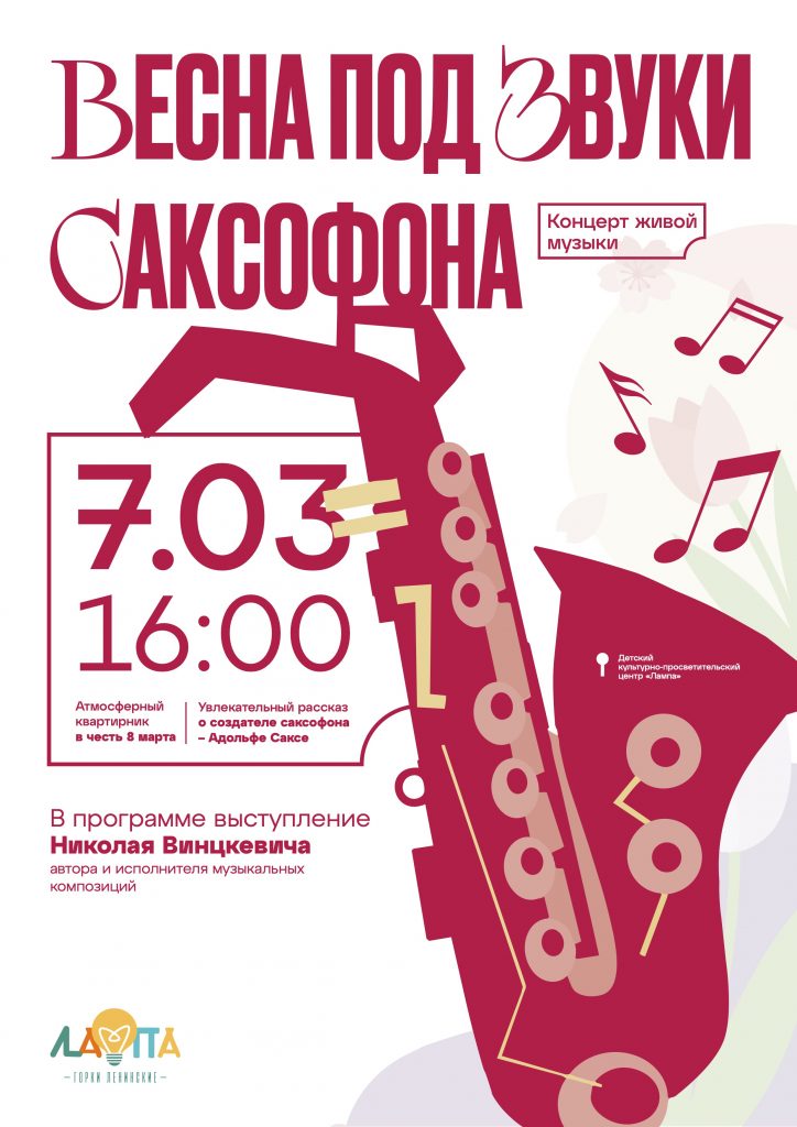 Атмосферный квартирник в честь 8 марта, в центре которого, звучание саксофона и увлекательный рассказ о его создателе – Адольфе Саксе. Через историю рождения инструмента гости смогут по-новому услышать его характер: от мягкой лирики до выразительной силы звучания. В программе: выступление Николая Винцкевича – автора и исполнителя музыкальных композиций, а также другие популярные произведения. Формат вечера камерный – для детей и взрослых, без сцены и дистанции. Нам важно сохранить атмосферу живого общения.